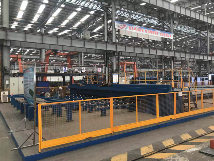 該設(shè)備主要由龍門綜合拼板架、物流傳送系統(tǒng)、焊接系統(tǒng)、數(shù)據(jù)監(jiān)控系統(tǒng)、集中潤滑系統(tǒng)、電氣控制系統(tǒng)、坡口機(jī)、焊接小車及電源和檢修機(jī)位手弧焊電源等組成,設(shè)備整體區(qū)域范圍10m*20m。采用正面液壓琴鍵壓緊、反面加水冷銅套襯墊成型槽的方式進(jìn)行拼板對接焊接,采用雙絲氣保焊工藝,實(shí)現(xiàn)工件單面焊雙面成型。此單面焊雙面成型焊接工藝避免了傳統(tǒng)的兩面焊工件翻身問題,節(jié)省場地,降低作業(yè)強(qiáng)度,提高了焊接效率,實(shí)現(xiàn)流水線焊接,該拼板單面自動(dòng)化焊接工作站各部分之間可協(xié)調(diào)動(dòng)作,采用PLC可編程序控制器集中控制方式,整體設(shè)計(jì)緊湊,自動(dòng)化程度高,便于操作。輔助機(jī)構(gòu)配置齊全,可充分發(fā)揮整機(jī)的性能。