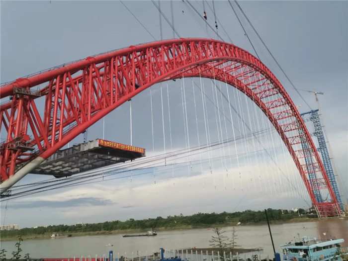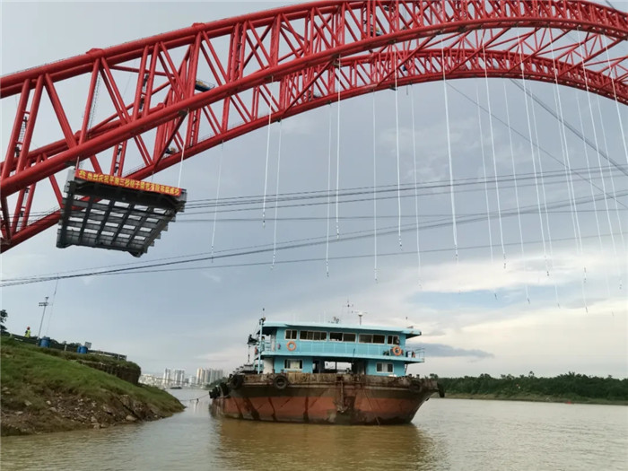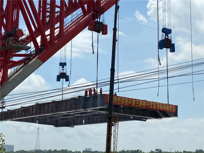 7月4日上午,由中國船舶武船集團武船重工股份承建的世界第一大跨度鋼管拱橋――平南三橋再次迎來關(guān)鍵節(jié)點,格子梁首節(jié)段(北岸PHL04N)精準落位,吊裝成功,線型和標高全部滿足設計規(guī)范要求,標志著大橋正式進入橋面梁施工階段。