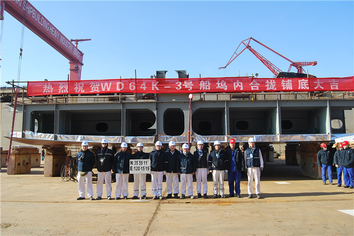 2018年12月28日上午,武船集團(tuán)北船重工承接的出口項(xiàng)目――6.4萬載重噸木屑運(yùn)輸船3號、4號船,在2號造船塢內(nèi)先后實(shí)現(xiàn)合攏鋪底,至此,承北船重工建的4艘6.4萬載重噸木屑運(yùn)輸船已全部按照生產(chǎn)節(jié)點(diǎn)計(jì)劃順利推進(jìn)。北船重工副總經(jīng)理周向陽和船東代表及相關(guān)監(jiān)造人員、驗(yàn)船師,NK船級社代表以及公司相關(guān)部門負(fù)責(zé)人出席了鋪底儀式。