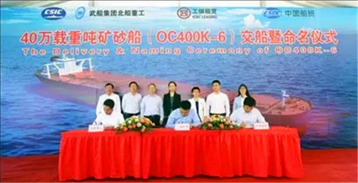40萬載重噸礦砂船6號船交船暨命名儀式在北船重工造船8號碼頭舉行。北船重工副總經(jīng)理于寶月主持儀式,武昌船舶重工集團有限公司黨委委員、北船重工總經(jīng)理王國海和工銀金融租賃有限公司資產(chǎn)管理部負責人戴琳先后致辭。