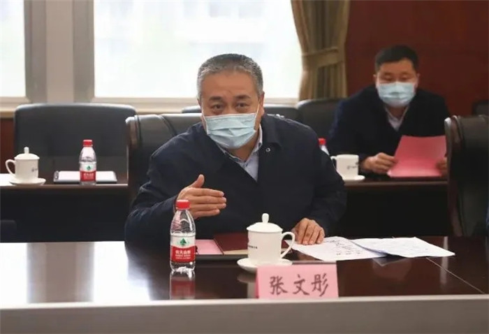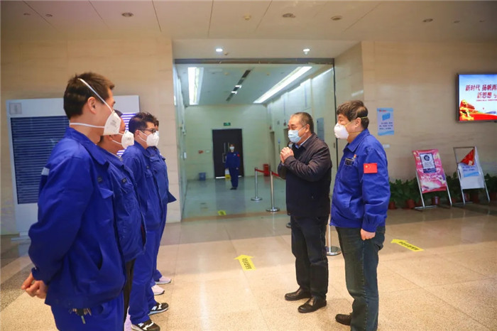▲張文彤在陳?降吶閫?下看望慰問(wèn)公司援建火神山、雷神山醫(yī)院的職工代表