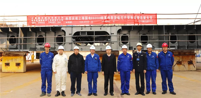 上海國電海運(yùn)有限公司副總經(jīng)理韓青、中國船級社青島分社驗船師肖楠、青島海事局鄭文杰、北船重工副總經(jīng)理于寶月及相關(guān)部門負(fù)責(zé)人出席86000噸散貨船1、2號船鋪底儀式。