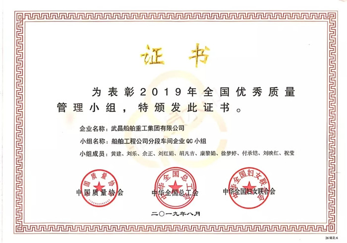 ▲船舶公司分段車間企業(yè)號QC小組獲得“2019年全國優(yōu)秀質(zhì)量管理小組”榮譽(yù)稱號