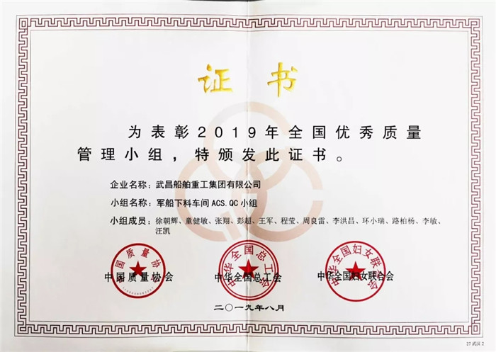 ▲軍船公司下料車間ACS.QC小組獲得“2019年全國優(yōu)秀質(zhì)量管理小組”榮譽(yù)稱號