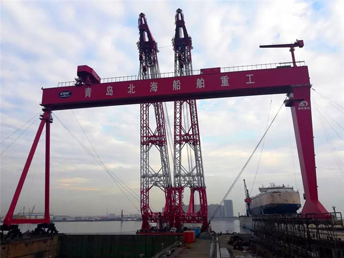 項目實施過程中,北船重工項目部在各級領(lǐng)導(dǎo)的支持和各部門人員的大力配合下,精心組織策劃,面對今年暴雨大風(fēng)天氣頻繁和大型活動影響等諸多不利因素,通過不斷優(yōu)化施工工藝,做好工序銜接,加班加點搶工期。在原南塢墻拆除中首次采用繩鋸切割拆除的新工藝,僅用12天時間完成了長70米、高13米、厚度達到7米的塢墻拆除和清理。500噸龍門吊三大件浮吊安裝受天氣、海況、超高空作業(yè)等因素影響大,大型構(gòu)件封固和安裝中存在很大的風(fēng)險,主梁與剛性腿和柔性腿的高空精確對位也是項目的重要難點,其中柔性鉸定位塊間隙只有2mm;項目部人員組織多次評審論證,反復(fù)討論安裝方案細節(jié)和安全保障措施,通過精心組織,500噸龍門起重機主梁順利一鉤到位,僅用一天時間就完成了2200噸主梁在76米高空的對位,安裝過程的安全和效率得到了保證。