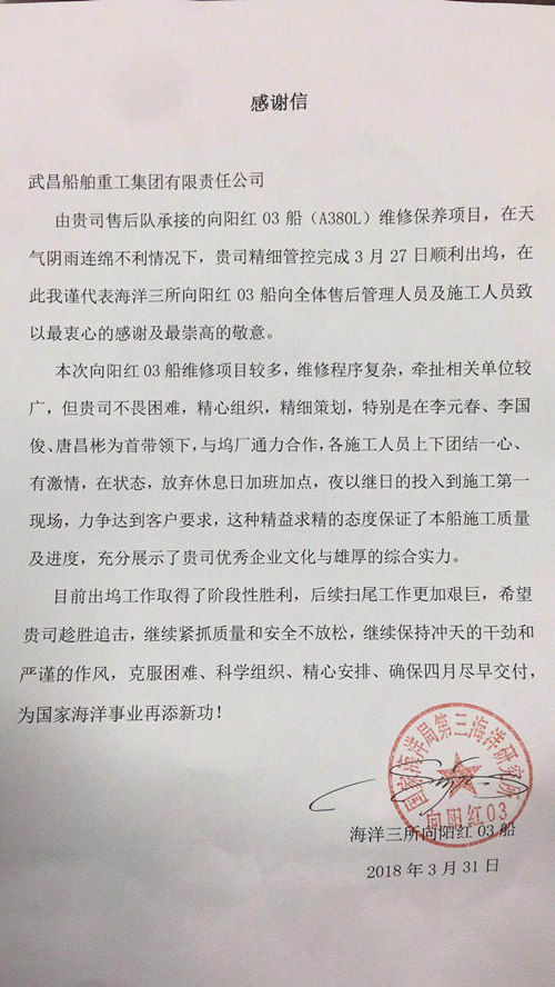 這封姍姍來遲的感謝信中,國家海洋局海洋三所表達了對武船集團全體售后人員最衷心的感謝及最崇高的敬意,特別對公司售后小組精心組織策劃、團結(jié)一心、夜以繼日、精益求精的態(tài)度給予高度贊揚和肯定!