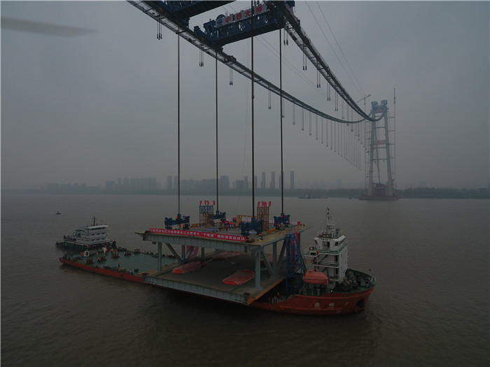 11月15日,由武船集團(tuán)制造的國內(nèi)首座跨長江雙層公路懸索橋――武漢楊泗港長江大橋首個(gè)鋼桁梁節(jié)段吊裝成功。