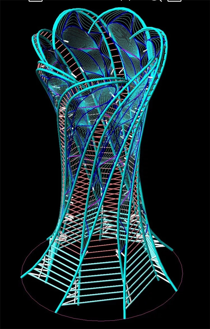 火炬塔周身“飄帶”的設(shè)計(jì)難點(diǎn)主要是三維扭曲的空間結(jié)構(gòu),既要確?,F(xiàn)場(chǎng)數(shù)據(jù)建模十分精準(zhǔn),又要考慮實(shí)際施工過(guò)程中高空交叉作業(yè)等問(wèn)題,所以最大程度上要避免干涉情況發(fā)生。