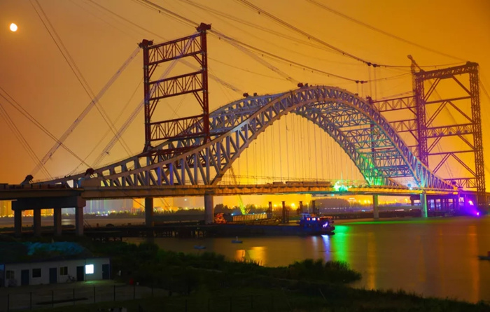 蘇嶺山大橋主拱在6月28日合龍后,武船重工股份項目部迅速啟動了主梁吊裝的工作,繼續(xù)發(fā)揮項目臨時黨支部的作用,迎難而上,先后克服了主梁安裝與臨時水平系桿安裝、吊桿安裝在高空交叉作業(yè)、體系轉(zhuǎn)換施工技術難度極大、因環(huán)保要求白天焊、割、刨作業(yè)被限制等重重困難,合理優(yōu)化吊裝工藝、工序,組織開展了多項勞動競賽,將原來每個主梁節(jié)段吊裝時間從9小時優(yōu)化到了6小時,從一天一吊優(yōu)化到一天兩吊。在主橋合龍沖刺階段,武船重工股份后場梁段及時供應,同時加派施工人員連續(xù)作業(yè),確保了最終合龍節(jié)點。