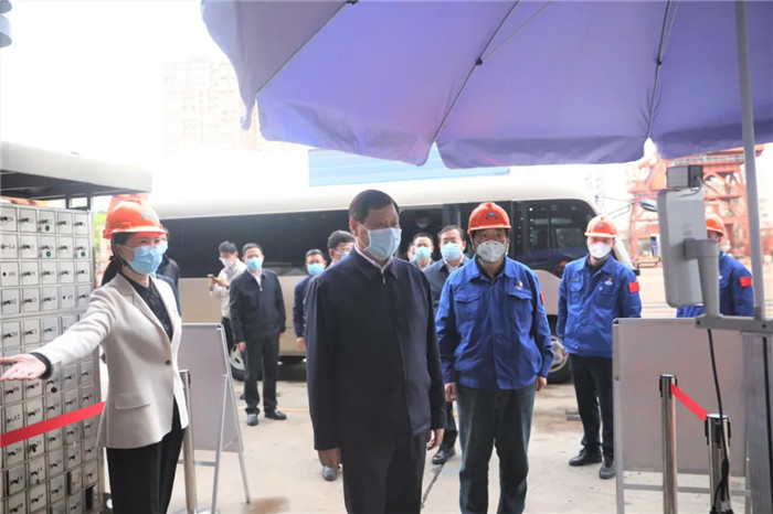 應(yīng)勇一下車便來到武船生產(chǎn)車間,登上作業(yè)平臺,深入一線實地考察企業(yè)復(fù)工復(fù)產(chǎn)情況。陳?較蛩?詳細介紹了公司產(chǎn)業(yè)布局、生產(chǎn)能力、重點產(chǎn)品,歷史沿革以及當(dāng)前在制重點產(chǎn)品生產(chǎn)建造情況和武船參加武漢市社區(qū)疫情防控工作情況。在目前國內(nèi)外防疫形勢依然嚴峻的情況下,公司為了有序推進武漢、青島兩大基地復(fù)工復(fù)產(chǎn),積極籌措防疫物資,建立防控工作機制,設(shè)立隔離觀察區(qū)域,消殺工作生活場所,集中管理返崗人員,開展安全生產(chǎn)檢查,并于近日得到主管部門批復(fù)后順利復(fù)工。