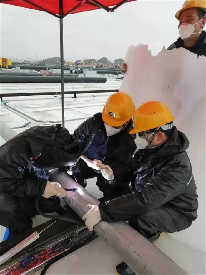 為了高質(zhì)量完成施工任務(wù),最大程度上避免環(huán)境因素影響,史善全、張志鋼、金英將管路初步安裝到位后,在隊(duì)長的帶領(lǐng)下就地取材,利用硬紙板和帆布搭起了臨時(shí)的焊接“小帳篷”,以方便陳繁強(qiáng)、黎文世進(jìn)行氬弧焊施工。