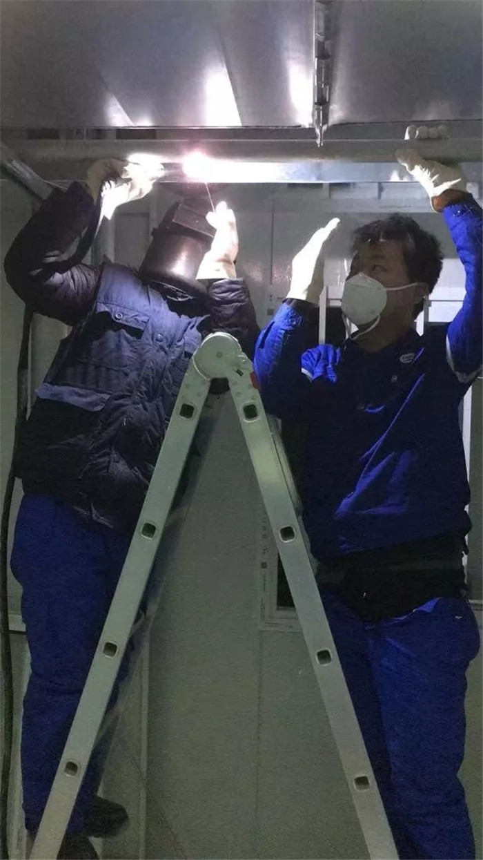 “火神山醫(yī)院每層天花板內(nèi)部空間小是小了一點(diǎn),燒焊燒到上面的時(shí)候,人進(jìn)不去,進(jìn)不去就看不到焊縫。于是,我們就在旁邊支架上,固定一塊小的反光鏡,對著鏡子繼續(xù)燒,這也是我們經(jīng)常會(huì)用到的方法。其實(shí),室內(nèi)施工還算好的,雷神山醫(yī)院頂樓天臺(tái)相當(dāng)于外場施工,聽說施工前一天晚上還下了大雨,可能會(huì)比較麻煩一些?!眳⑴c火神山建設(shè)的龔思帆說道。