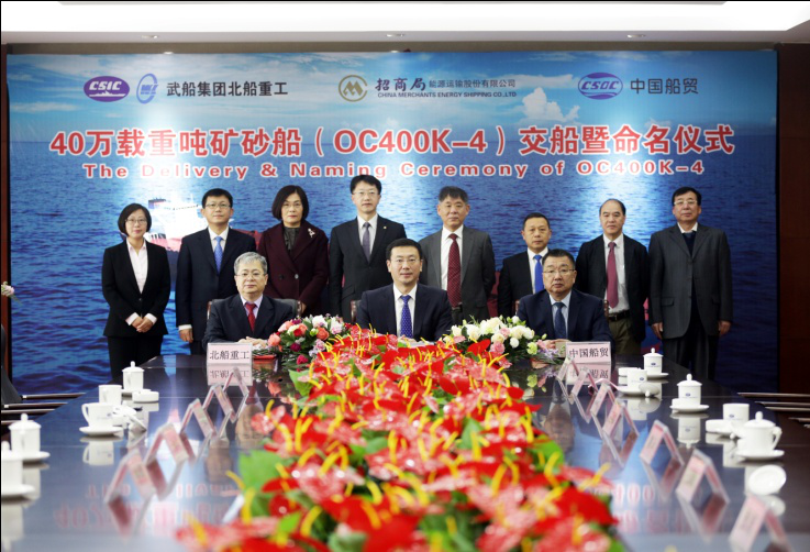 2月22日,武船集團北船重工為招商局能源運輸股份有限公司建造的第四艘新型40萬噸礦砂船“明青”輪命名交付。這是北船重工今年交付的第1艘船舶,也是40萬噸系列礦砂船中完工的第7艘船。