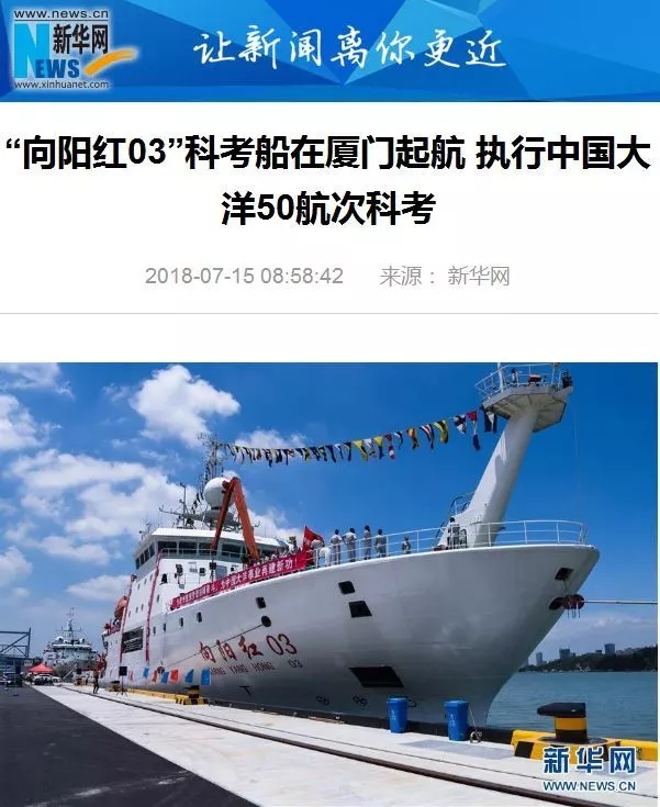 各大媒體紛紛報(bào)道的正是“向陽紅03”船出發(fā)的消息?C?C7月14日,搭載著中國大洋50航次科考隊(duì)的“向陽紅03”船從廈門起航。
