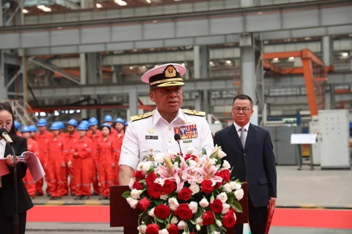 中船重工副總經(jīng)理何紀(jì)武、馬來西亞皇家海軍司令卡瑪魯扎曼上將赴開工現(xiàn)場并致辭。卡瑪魯扎曼,何紀(jì)武,莫實(shí)德船廠總裁拉姆利,國防科工局軍貿(mào)與外事司副巡視員馬衛(wèi)華,中船重工總經(jīng)理助理、中國船貿(mào)黨委書記、董事長徐子秋,武船集團(tuán)黨委書記、董事長楊志鋼共同觸摸水晶球,啟動(dòng)切割指令。